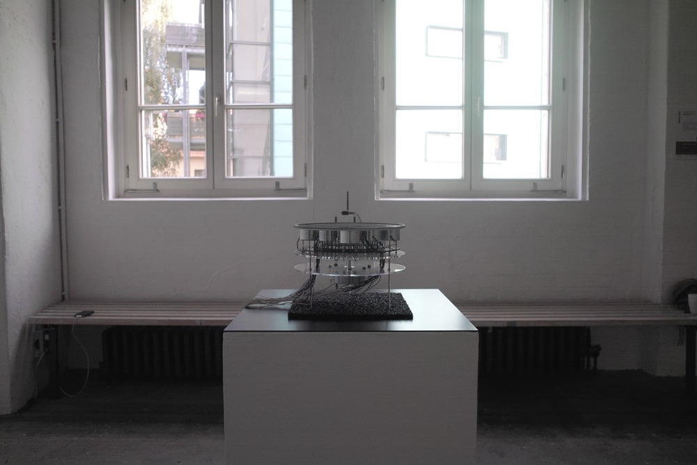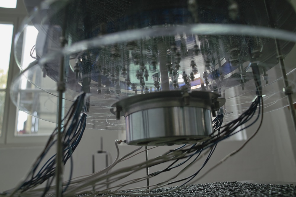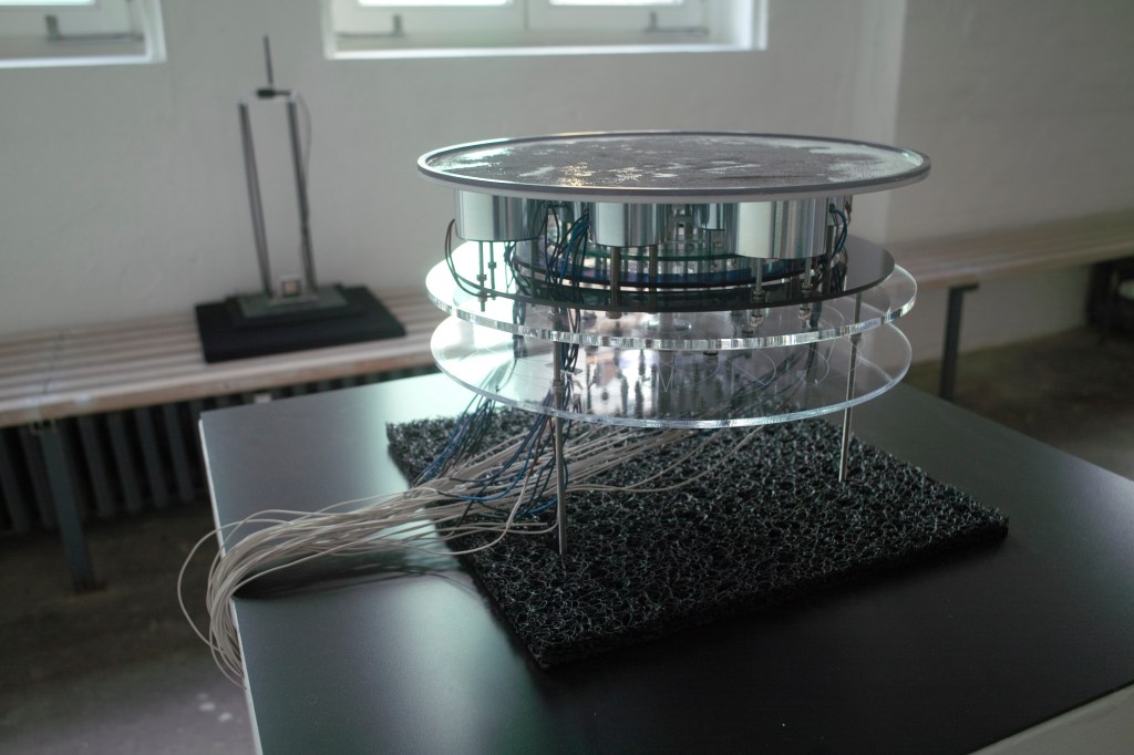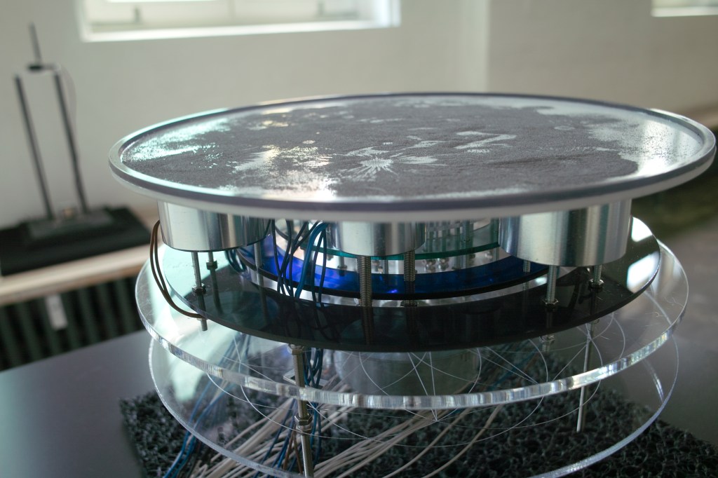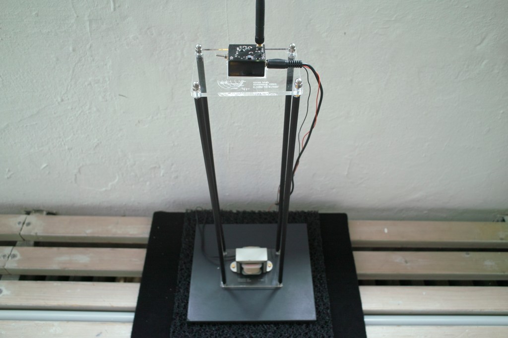 Installation object – plexiglas, transducer, electromagnets, computer, microcontroller, electronics, electro- magnetic sensors.